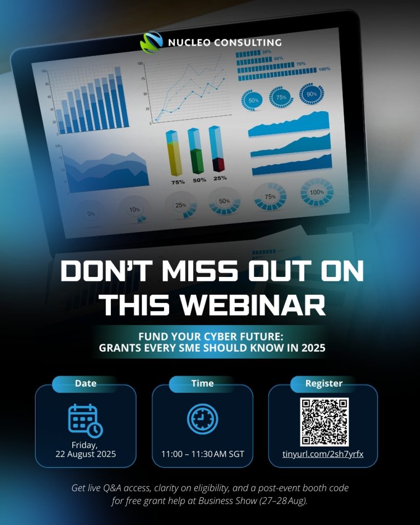 On Friday, 22 August 2025, at 11:00 AM (SGT), Nucleo Consulting will host a free, 30-minute webinar designed to help Singapore SMEs secure their business and make the most of available government grants — without overspending.