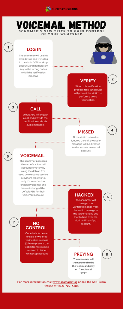 The scammer will then use the code provided via voicemail for verification to take over the victimâs WhatsApp account. Once in control, the scammer can enable a two-step verification (2FA) to prevent the victim from regaining control of this WhatsApp account.