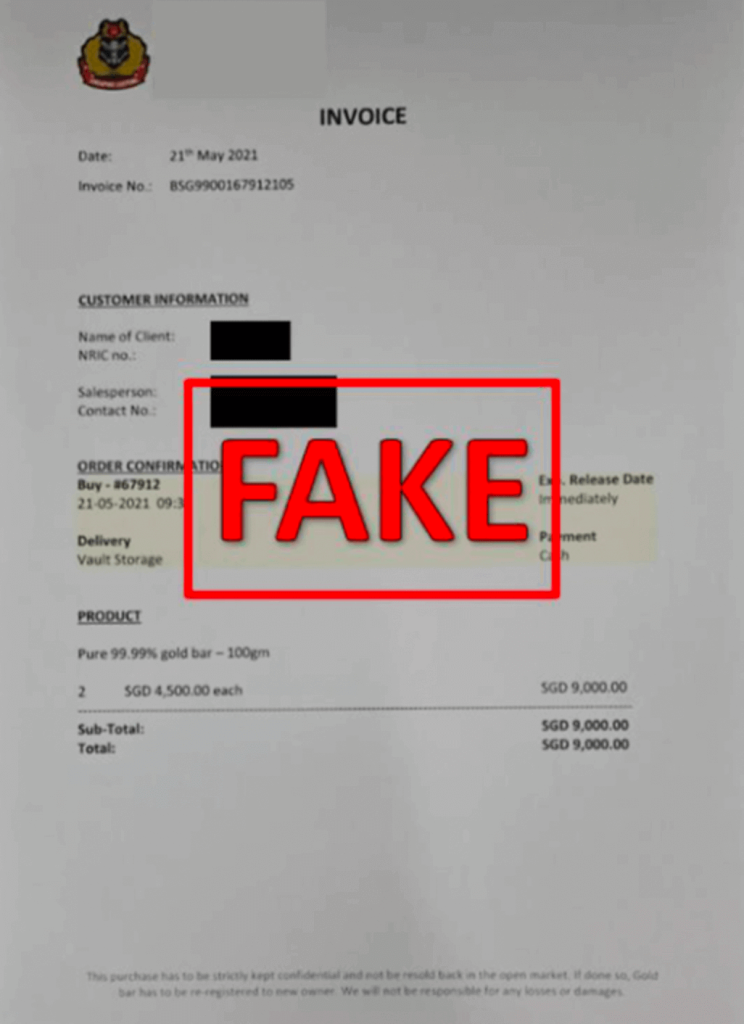 While this may sound âtoo-good-to-be-trueâ to some, most would still give it a second thought, especially when it was sent in by a close friend or a relative. To sound more convincing, the scammers explained that these gold bars were sold cheap as they were seized by the Singapore customs (Immigration and Checkpoints Authority) and were on auction. Counterfeit invoices from the Singapore Customs would be provided to lure the victims to do a payment transfer to a list of bank accounts. Some victims were even told to meet the scammers to collect the gold bars.