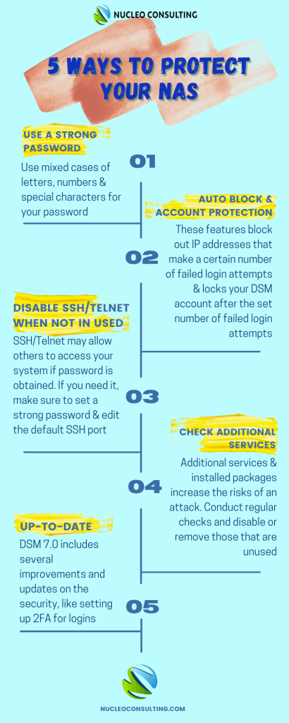 All devices need to be maintained. Maintenance for your NAS is crucial as it often contains files and data which are important to the users or the company. IT managers or IT consultants should ensure that your NAS is up to date, do regular checks on the NAS performance, storage status, and check for system updates for your NAS. Your IT manager or IT consultant should monitor the services and packages used, and check for any abnormal issues affecting any services which are important for your business operations.