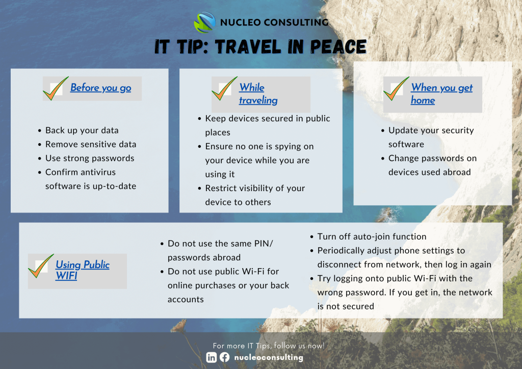 The threat of cyber-crime is very real, and the probability of that threat increases when we are vulnerable. That is why a good cybersecurity mindset while traveling is a must. Whether you are traveling for work or vacation, be sure to practice these tips and proceed with caution.