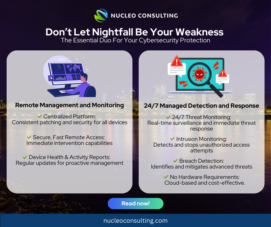 Cyber-attacks pose a serious threat, especially during off-hours, but with the perfect combo of the 24/7 Managed Detection and Response (MDR) and Remote Monitoring and Management (RMM), your business can stay protected around the clock. Don’t let your defenses falter after hours—invest in continuous cybersecurity to safeguard against overnight threats. The potential financial impact of ignoring nighttime cyber-attacks far outweighs the investment in robust cybersecurity measures.