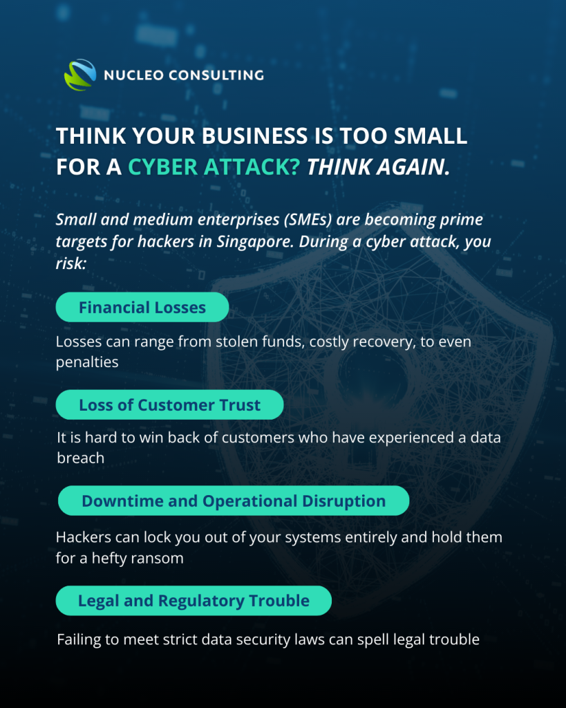 Cybercriminals don’t discriminate. If your systems are online, you’re a potential target. But the good news is: you don’t have to do it alone. At Nucleo Consulting, we’re here to help Singapore’s SMEs stay safe, smart, and strong — with cybersecurity solutions that actually work.